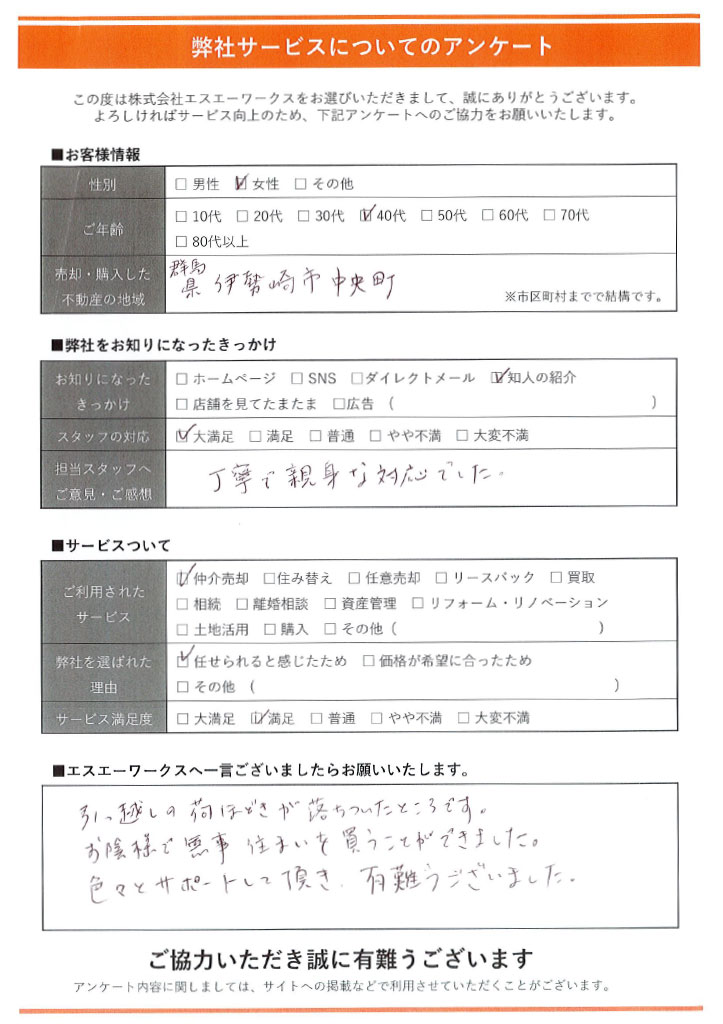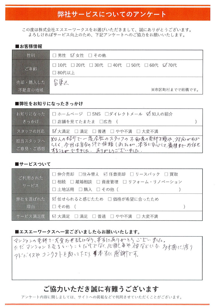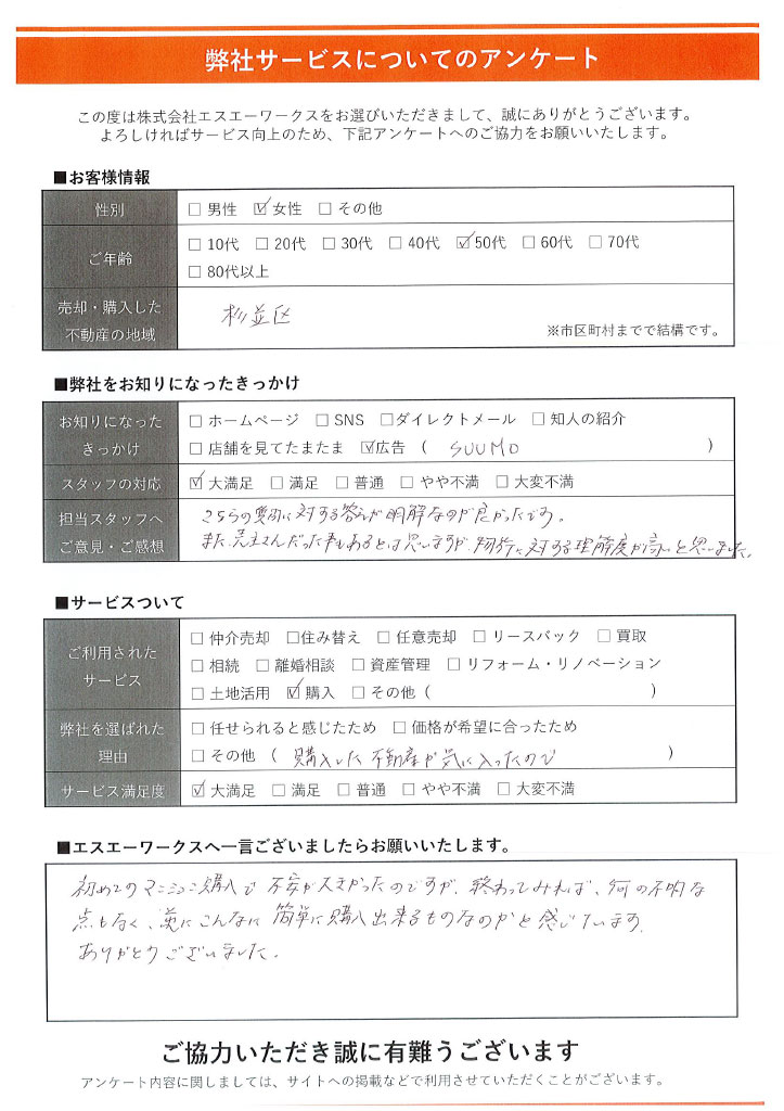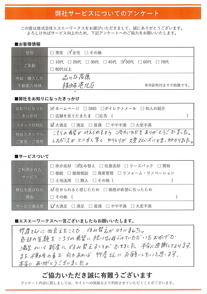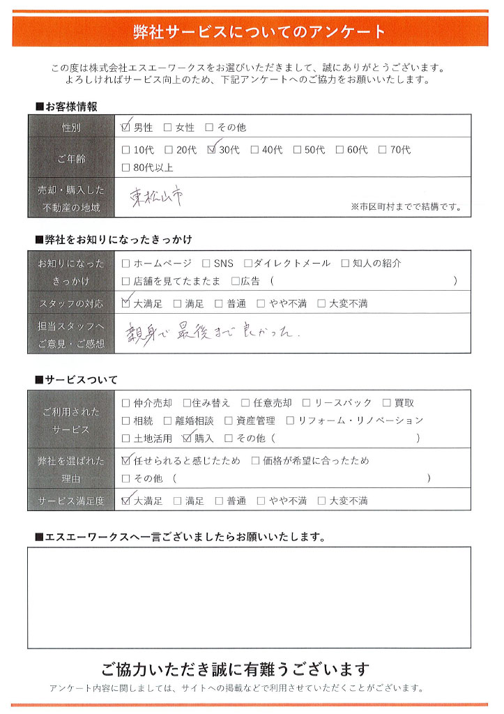 当社の特徴は、「お客様との距離が近い」こと。お客様の立場に立ち、常に寄り添って問題解決に努めてきた結果、お陰様でたくさんの喜びの声をいただいています。こちらでは、お客様にお書きいただいたアンケートをご紹介します。