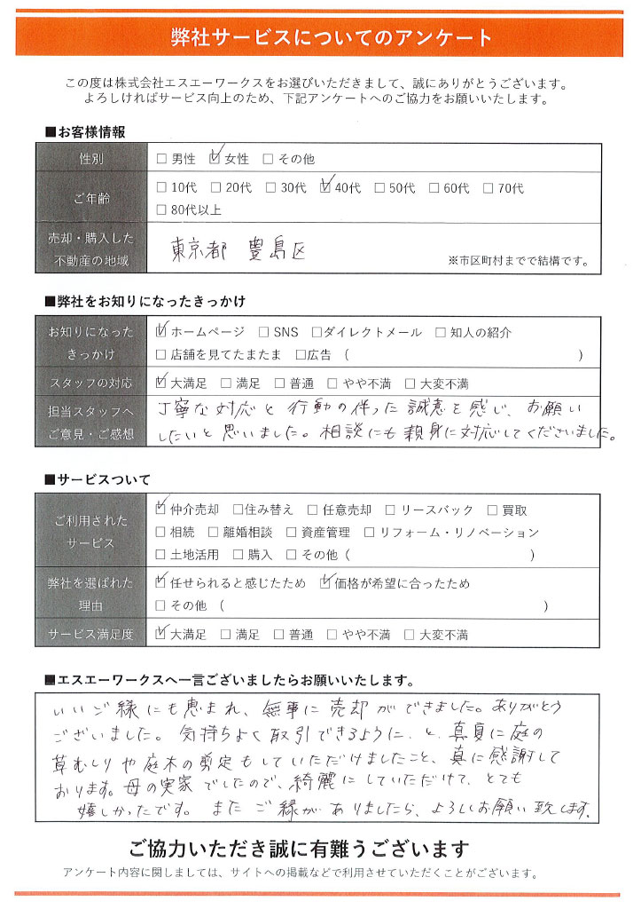| 地域 | 豊島区 | 建物種別 | 戸建て | 職業 | 会社員 |
