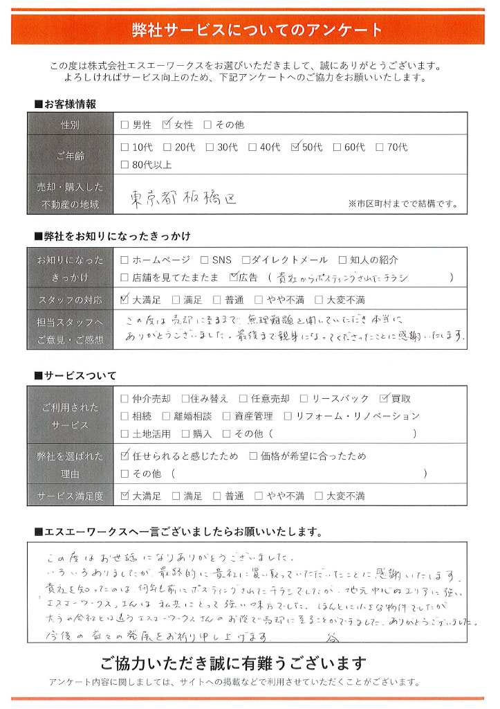 | 地域 | 板橋区 | 建物種別 | 戸建て | 職業 | 無職 |